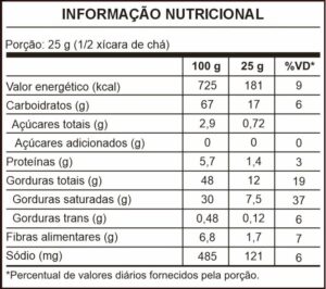 Batata, óleo vegetal de palma e sal. ALÉRGICOS: PODE CONTER SOJA, TRIGO, AVEIA, OVOS, AMENDOIM E LEITE. CONTÉM GLÚTEN.