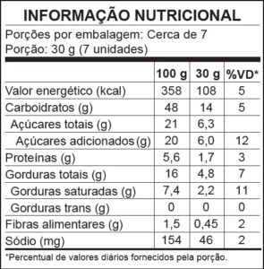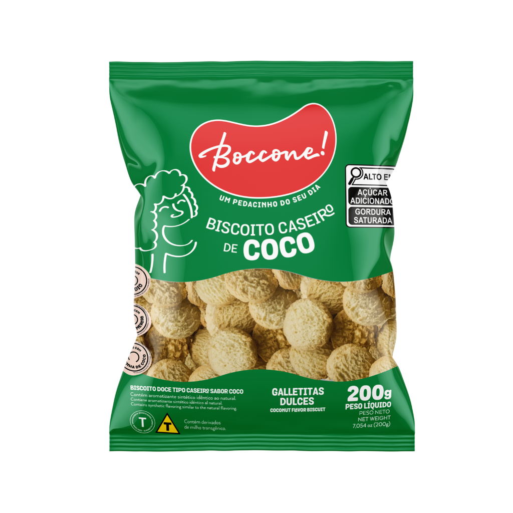 Amido de milho, farinha de trigo enriquecida com ferro e ácido fólico, açúcar demerara, ovo líquido pasteurizado, gordura vegetal de palma, coco ralado integral, farinha de coco, glicose de milho, sal, soro de leite em pó, extrato de malte, fermento químico: bicarbonato de amônio e aromatizantes. ALÉRGICOS: CONTÉM OVOS E DERIVADOS DE TRIGO E LEITE. PODE CONTER AMENDOIM, AVEIA E SOJA. CONTÉM LACTOSE. CONTÉM GLÚTEN.
