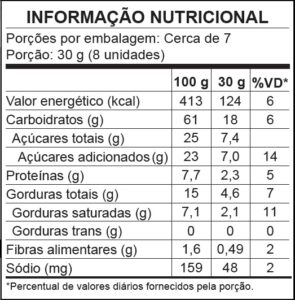 Farinha de trigo enriquecida com ferro e ácido fólico, açúcar demerara, amido de milho, ovo líquido pasteurizado, gordura vegetal de palma, nata, fécula de mandioca, farinha de aveia, manteiga, coco ralado integral, glicose de milho, sal, fermento químico: bicarbonato de amônio e aromatizantes. ALÉRGICOS: CONTÉM OVOS E DERIVADOS DE TRIGO, LEITE E AVEIA. PODE CONTER AMENDOIM E SOJA. CONTÉM LACTOSE. CONTÉM GLÚTEN.