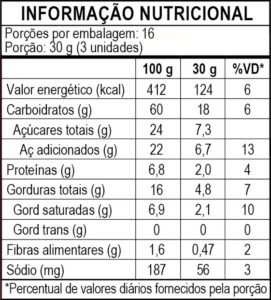 Farinha de trigo enriquecida com ferro e ácido fólico, amido de milho, açúcar cristal, ovo líquido pasteurizado, gordura vegetal de palma, manteiga, coco ralado integral, soro de leite em pó, extrato de malte, sal, glicose de milho, fermentos químicos: bicarbonato de sódio e bicarbonato de amônio e aromatizantes. ALÉRGICOS: CONTÉM OVOS E DERIVADOS DE TRIGO E DE LEITE. PODE CONTER AMENDOIM, AVEIA E SOJA. CONTÉM LACTOSE. CONTÉM GLÚTEN.