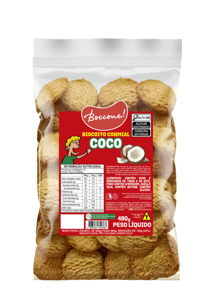 Farinha de trigo enriquecida com ferro e ácido fólico, açúcar cristal, amido de milho, gordura vegetal de palma, ovo líquido pasteurizado, coco ralado integral, glicose de milho, sal, soro de leite em pó, fermentos químicos: bicarbonato de sódio e bicarbonato de amônio e aromatizantes. ALÉRGICOS: CONTÉM OVOS E DERIVADOS DE TRIGO E DE LEITE. PODE CONTER AMENDOIM, AVEIA E SOJA. CONTÉM LACTOSE. CONTÉM GLÚTEN.