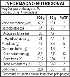 Farinha de trigo enriquecida com ferro e ácido fólico, açúcar cristal, amido de milho, gordura vegetal de palma, ovo líquido pasteurizado, coco ralado integral, glicose de milho, sal, soro de leite em pó, fermentos químicos: bicarbonato de sódio e bicarbonato de amônio e aromatizantes. ALÉRGICOS: CONTÉM OVOS E DERIVADOS DE TRIGO E DE LEITE. PODE CONTER AMENDOIM, AVEIA E SOJA. CONTÉM LACTOSE. CONTÉM GLÚTEN.