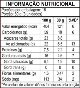 Farinha de trigo enriquecida com ferro e ácido fólico, amido de milho, açúcar cristal, ovo líquido pasteurizado, gordura vegetal de palma, nata, coco ralado integral, glicose de milho, sal, emulsificante: lecitina de soja, fermento químico: bicarbonato de amônio e aromatizantes. ALÉRGICOS: CONTÉM OVOS E DERIVADOS DE TRIGO, SOJA E LEITE. PODE CONTER AMENDOIM E AVEIA. CONTÉM LACTOSE. CONTÉM GLÚTEN.