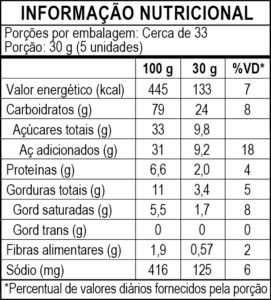 Farinha de trigo enriquecida com ferro e ácido fólico, açúcar cristal, amido de milho, gordura vegetal de palma, açúcar invertido, soro de leite em pó, sal, cacau em pó, glicose de milho, corante: caramelo IV, emulsificante: lecitina de soja, fermentos químicos: bicarbonato de sódio e bicarbonato de amônio e aromatizantes. ALÉRGICOS: CONTÉM DERIVADOS DE TRIGO, LEITE E SOJA. PODE CONTER OVOS, AMENDOIM E AVEIA. CONTÉM LACTOSE. CONTÉM GLÚTEN.