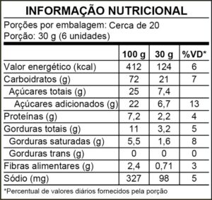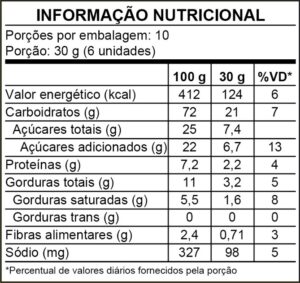 Farinha de trigo enriquecida com ferro e ácido fólico, açúcar cristal, farinha de milho, gordura vegetal de palma, açúcar invertido, amido de milho, soro de leite em pó, sal, emulsificante: lecitina de soja, fermentos químicos: bicarbonato de sódio e bicarbonato de amônio e aromatizantes. ALÉRGICOS: CONTÉM DERIVADOS DE TRIGO, LEITE E SOJA. PODE CONTER OVOS, AMENDOIM E AVEIA. CONTÉM LACTOSE. CONTÉM GLÚTEN.